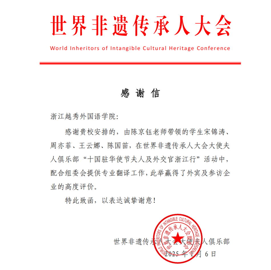 2024年12月28日至12月30日,受主办方负责人邀请,我校英语学院翻译系教师陈京钰带领翻译2201班宋锦涛、翻译2202班陈国苗、翻译2203班周亦菲和王云娜四位同学,前往杭州参与由世界非遗传承人大会和驻华大使夫人俱乐部联合举办的系列活动。此次活动中,翻译系师生为驻华外交官及使节夫人们的浙江行提供了专业的口译服务,为推动国际文化交流发展和中国企业宣传贡献了重要力量。
